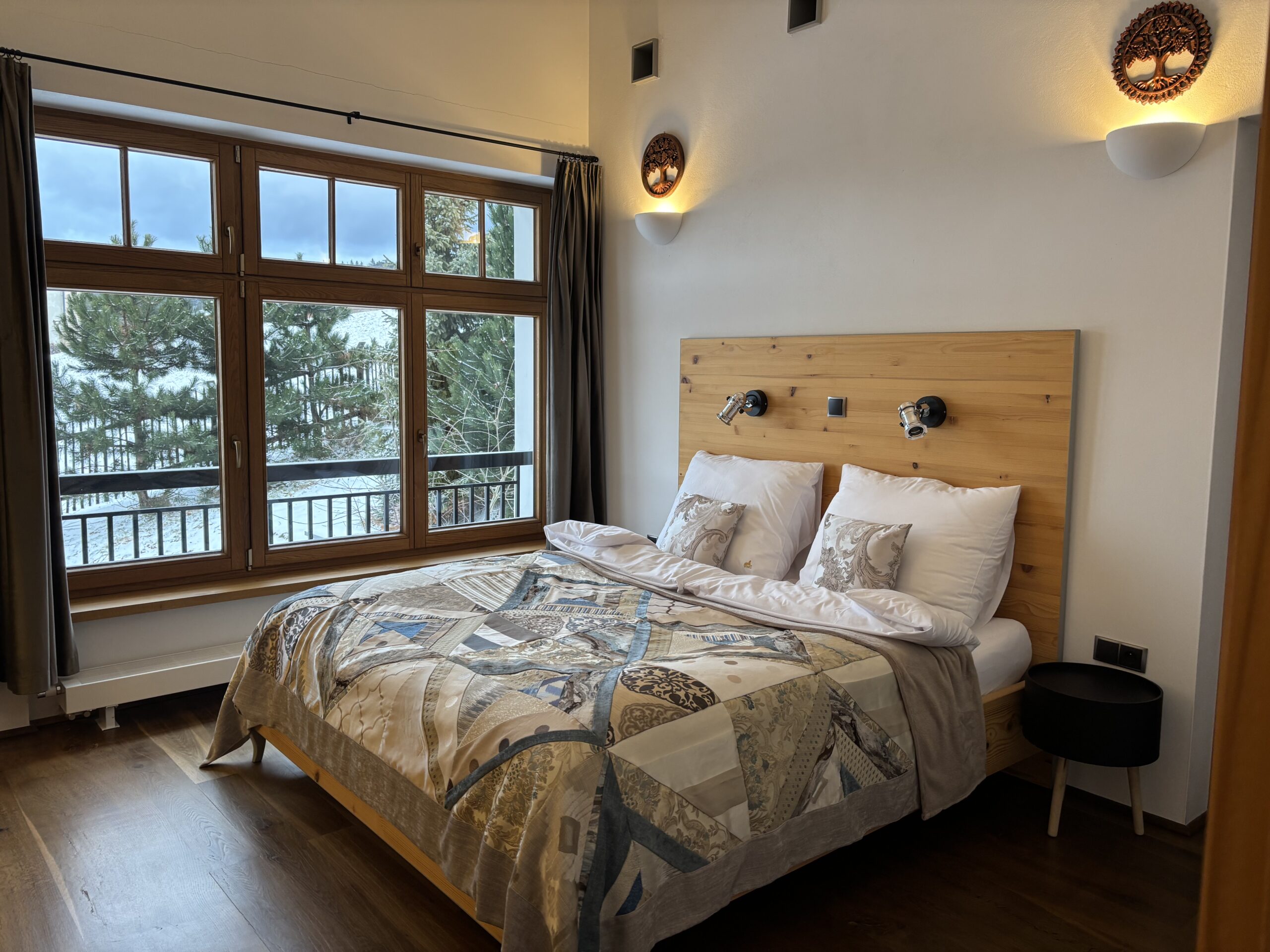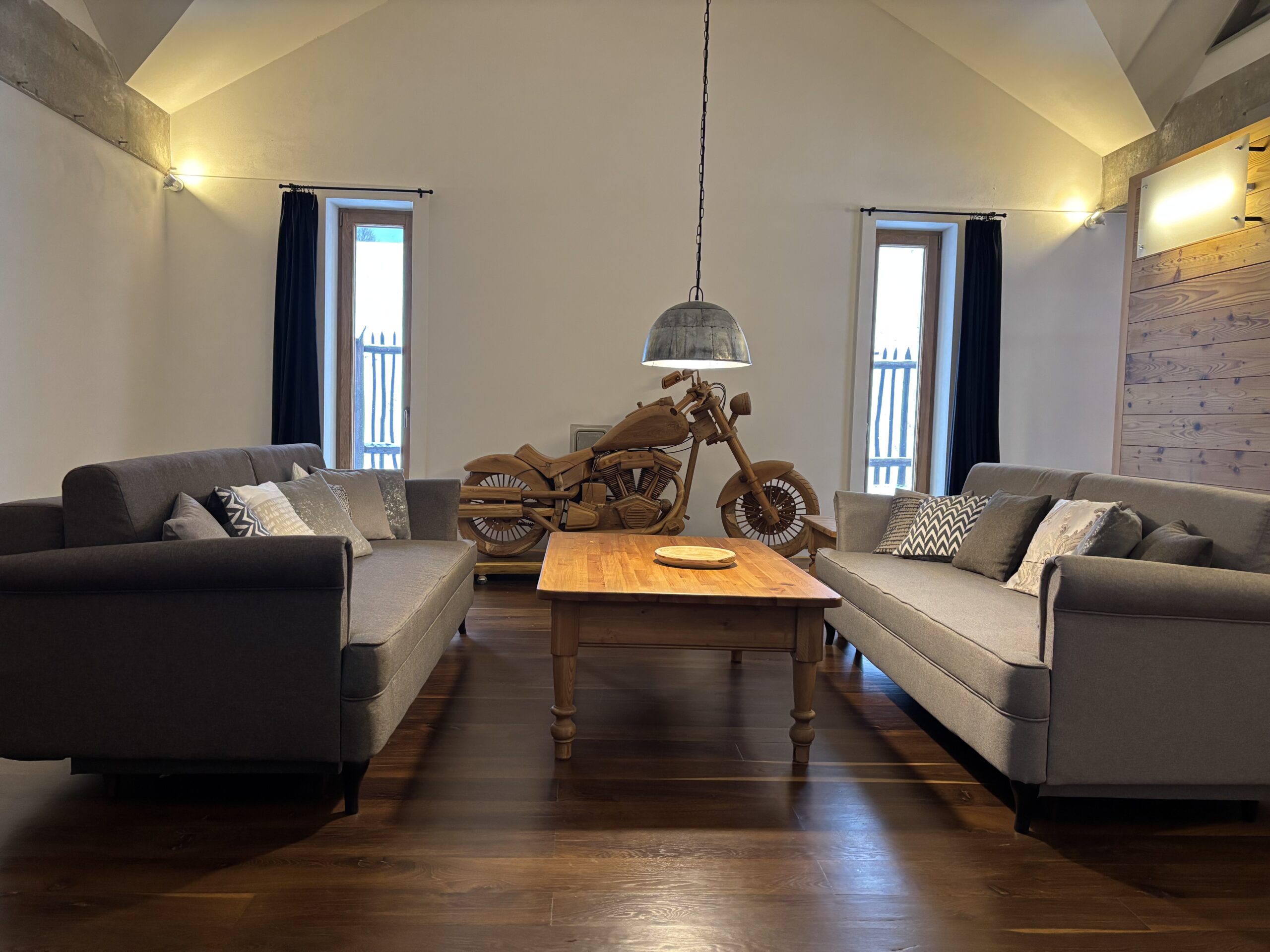 Apartament „Moto jama” przeznaczony jest dla 6 osób. To olbrzymia przestrzeń, w której znajduje się oddzielna sypialna z podwójnym łóżkiem i własną garderobą, dwa pojedyncze łóżka, oraz dwa dodatkowe pojedyncze łóżka na antresoli, do której prowadzą kręcone schody. Poza tym są duże szafy, konsolki, sofy wypoczynkowe, łazienka oraz własny taras z wyjściem do ogrodu. Cena 920 zł za dobę w okresie wakacyjnym oraz w pozostałych miesiącach dla pobytów nie krótszych niż 3 dni (po 170 zł na osobę w oddzielnej sypialni i na pojedynczych łóżkach, oraz po 120 zł od osoby za łóżko na antresoli). W przypadku dwóch dni cena wynosi 1040 zł na dobę (po 190 zł na osobę w oddzielnej sypialni i na pojedynczych łóżkach, oraz po 140 zł od osoby za łóżko na antresoli).